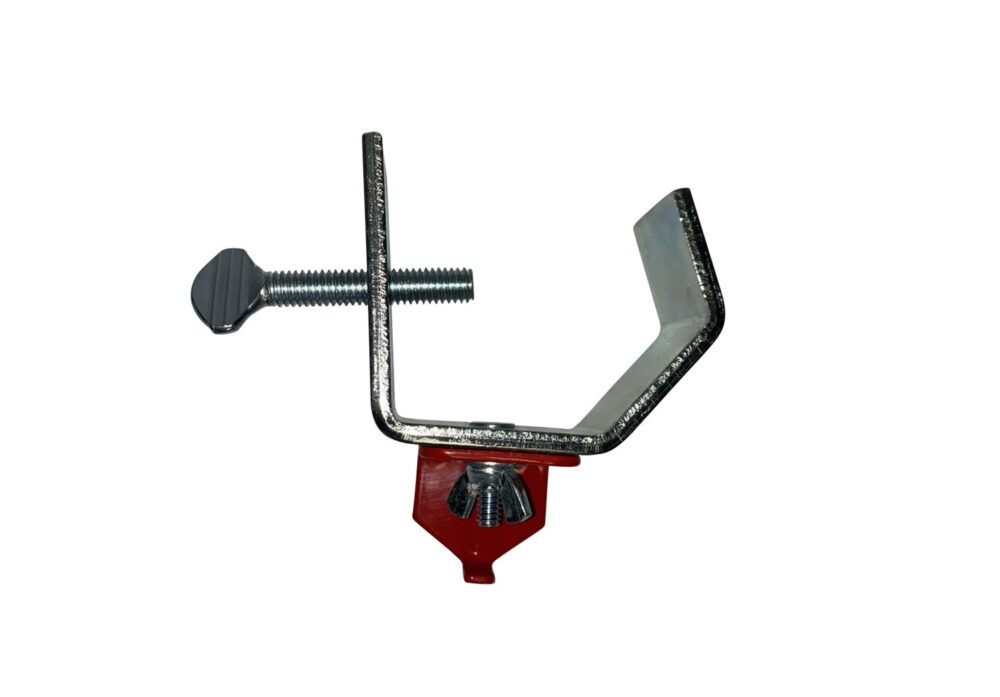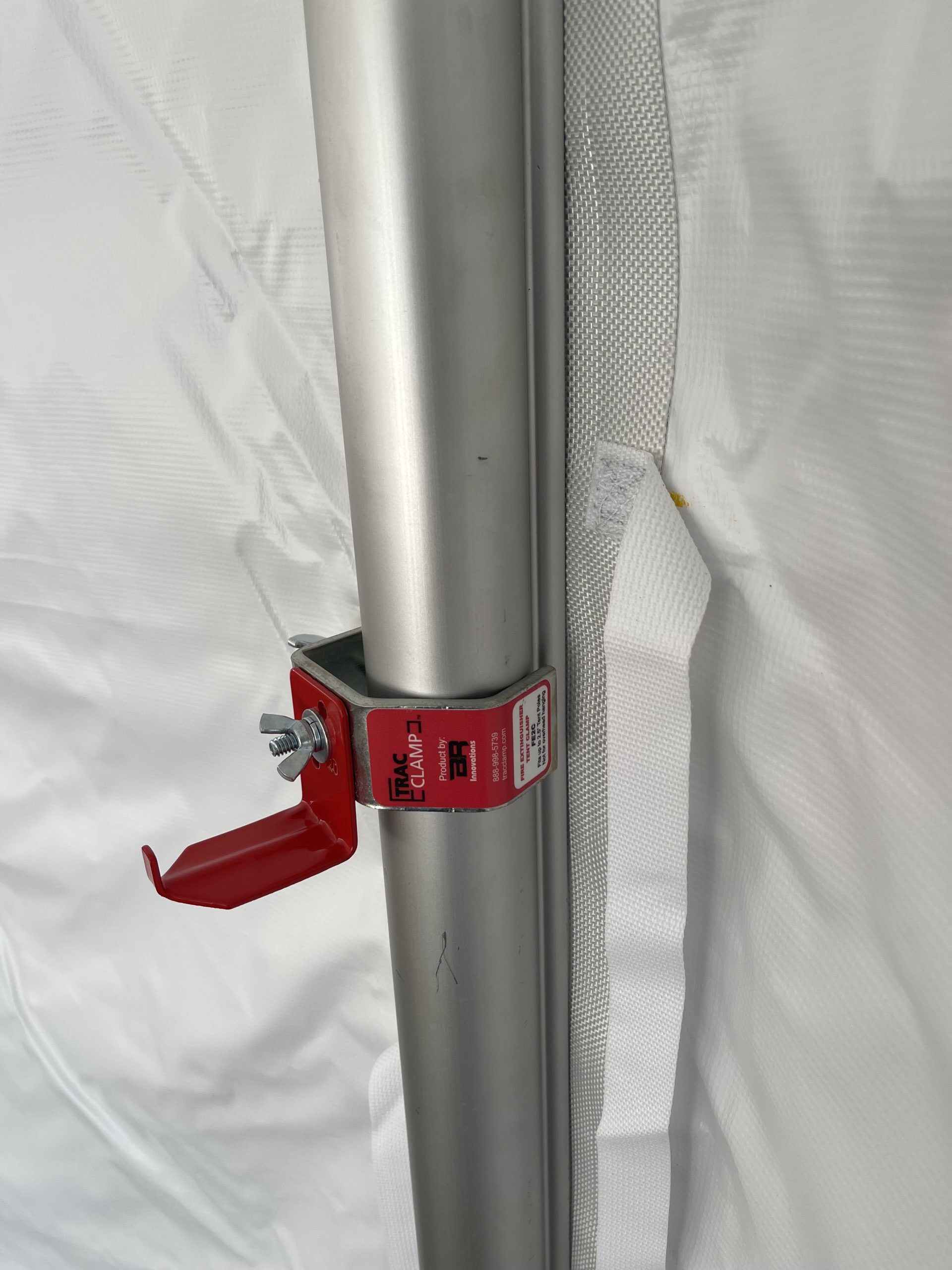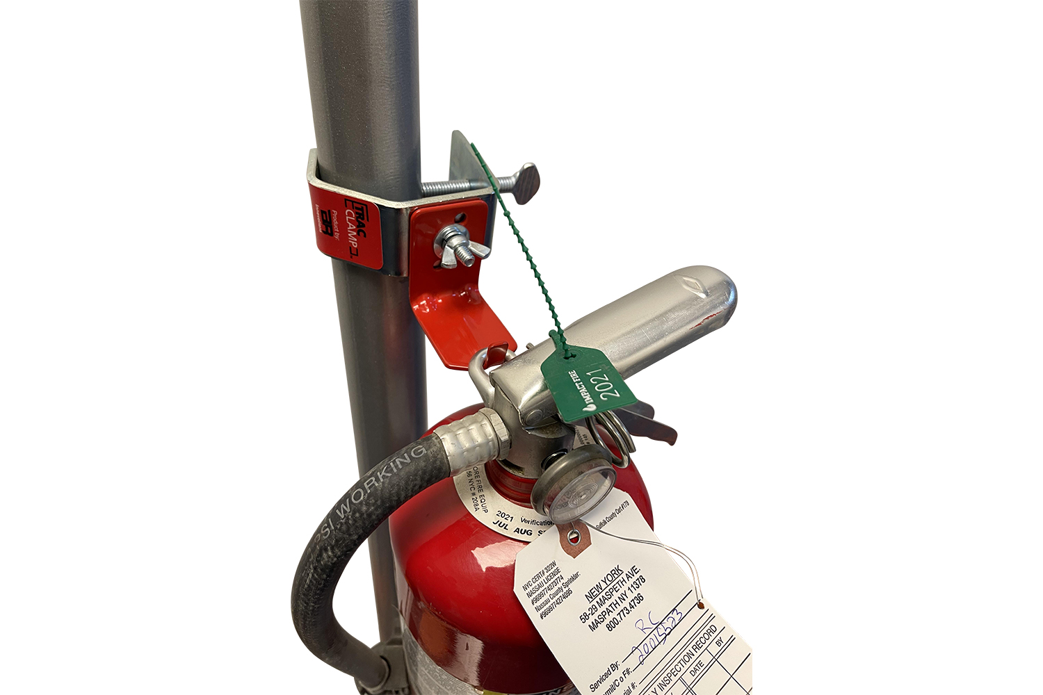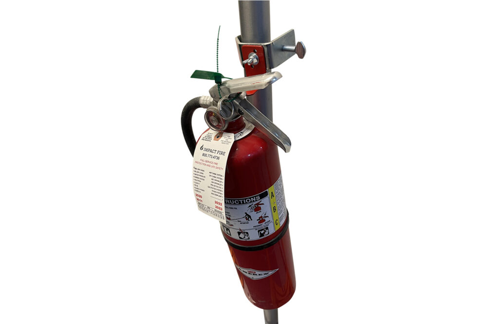 Clamp on Fire Extinguisher bracket fits most round tent poles up to 2.5″ OD. Zinc coated steel bracket.