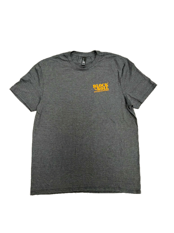 Grey with Block And Roll® weathered Logo on front and Block Responsibly weathered logo on back.