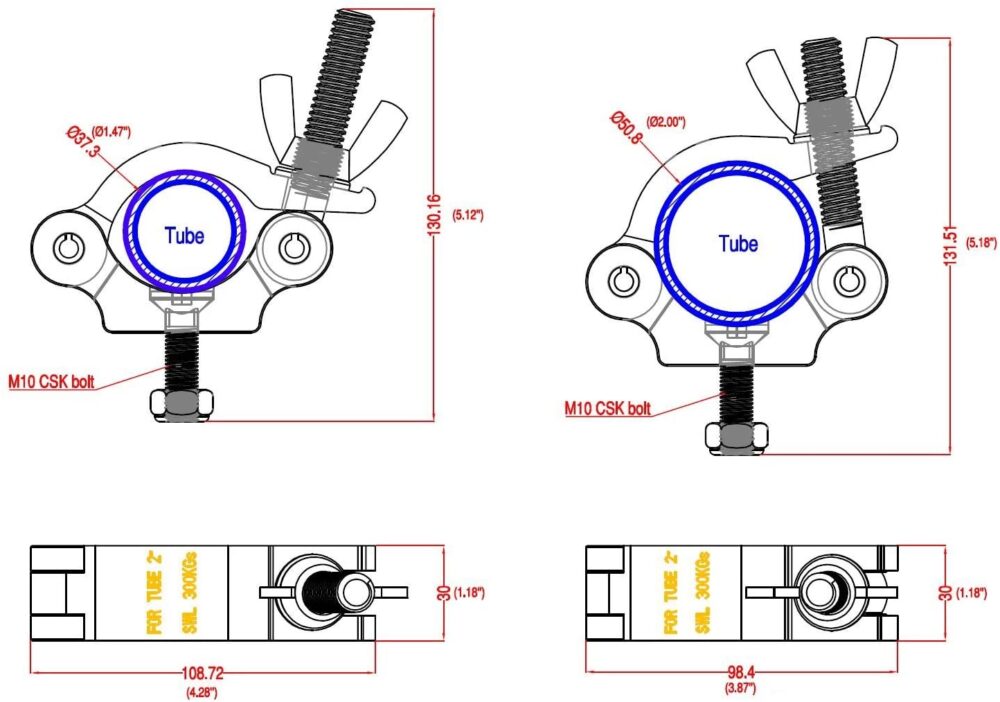 Heavy duty aluminum alloy stage clamps for long lasting durability; Load Capacity: 300kg /660lb. 38-51mm/1.5-2 inch diameter