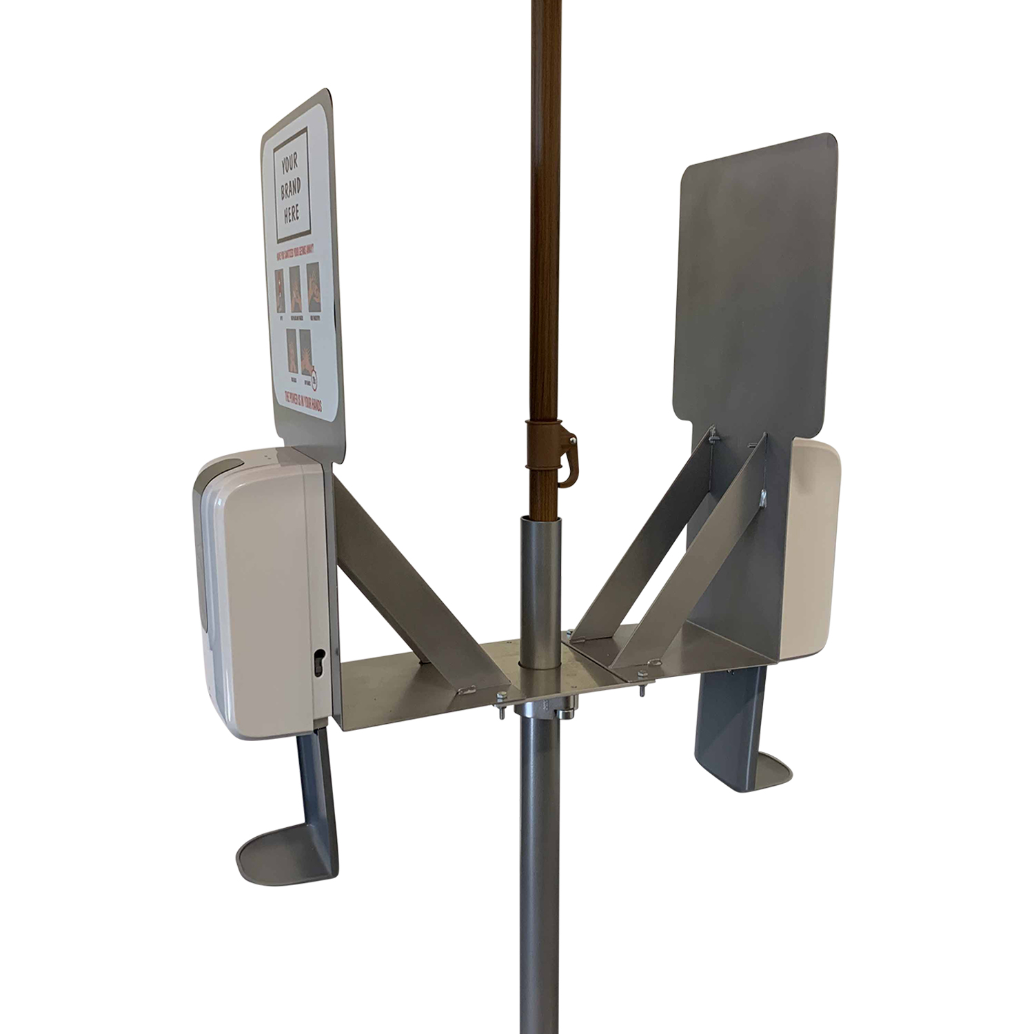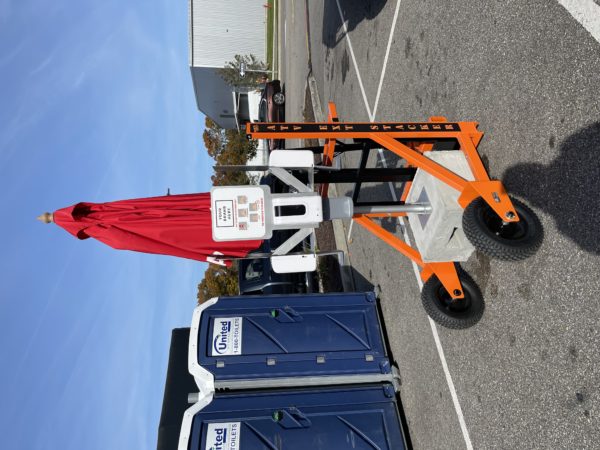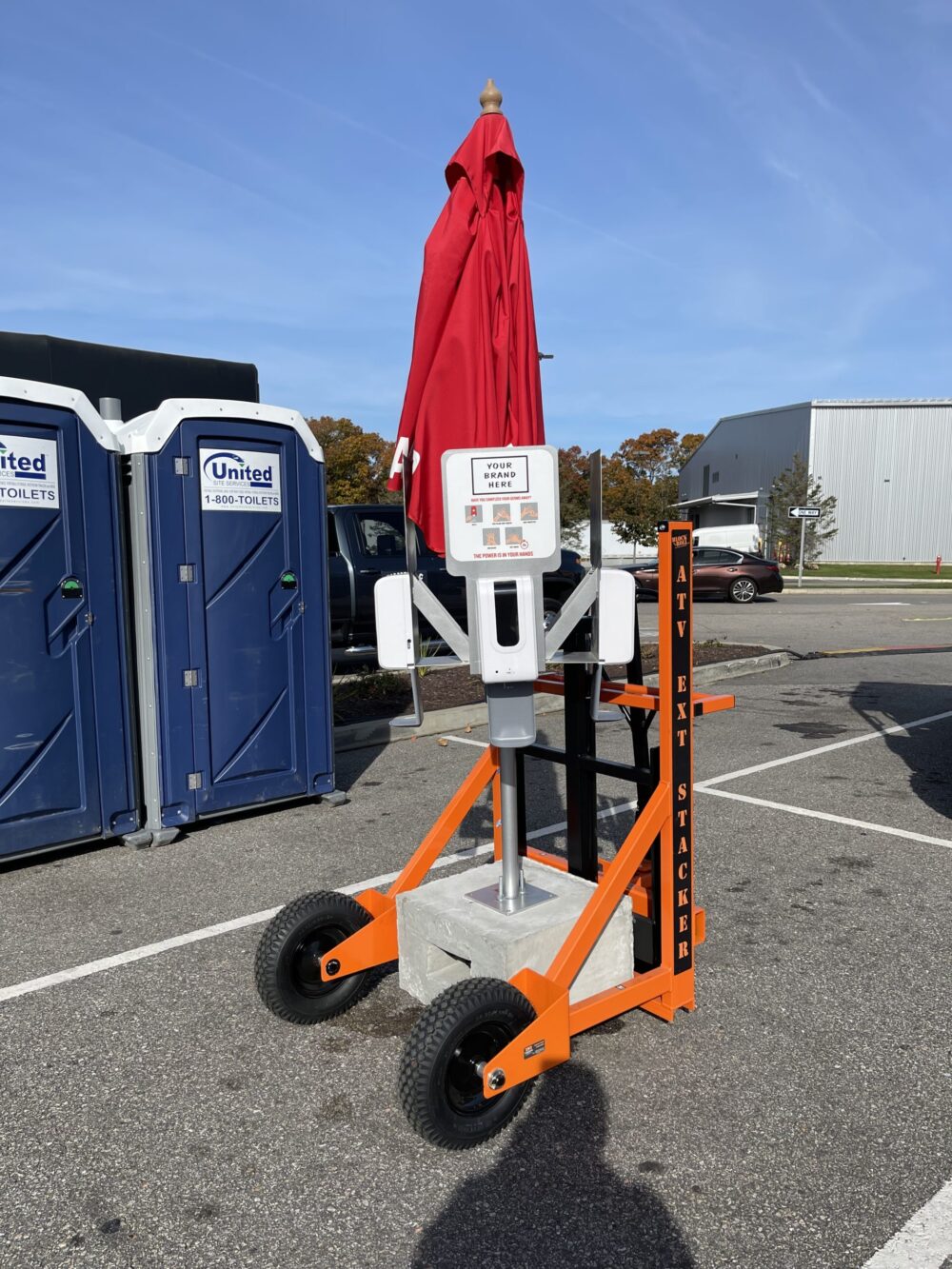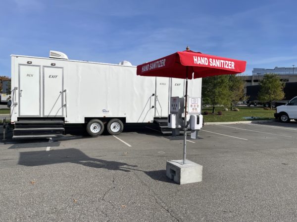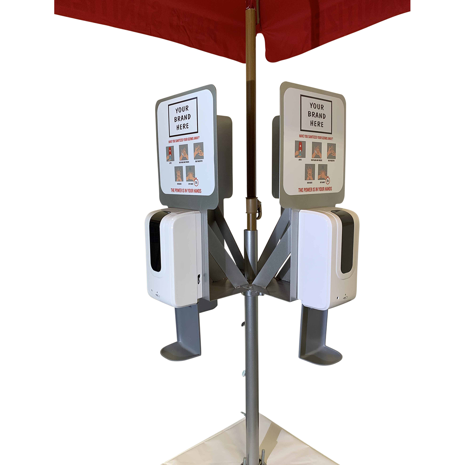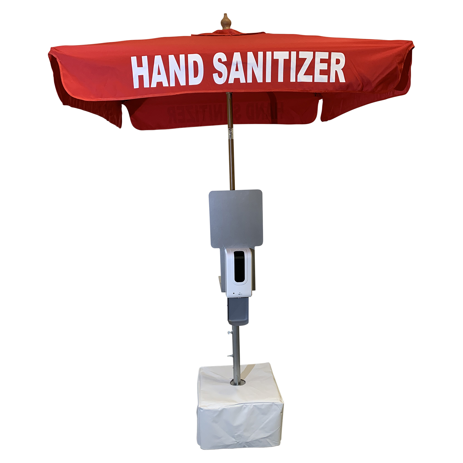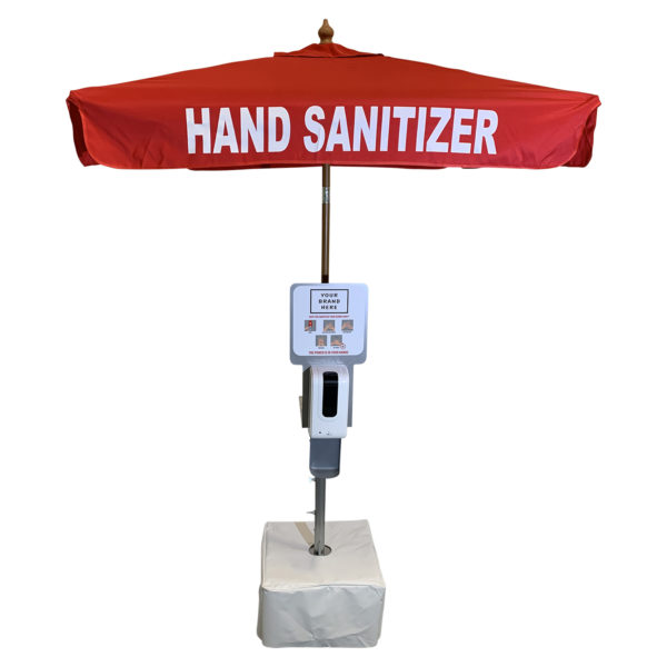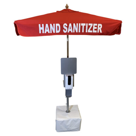 Unit includes 350lb concrete base, vinyl base cover, pole mount with umbrella pole, 1-4 sanitizer dispensers with brackets, 7′ Red “Hand Sanitizer” market umbrella.