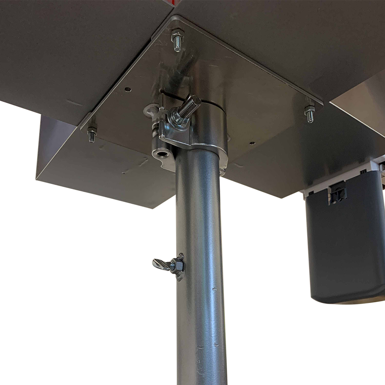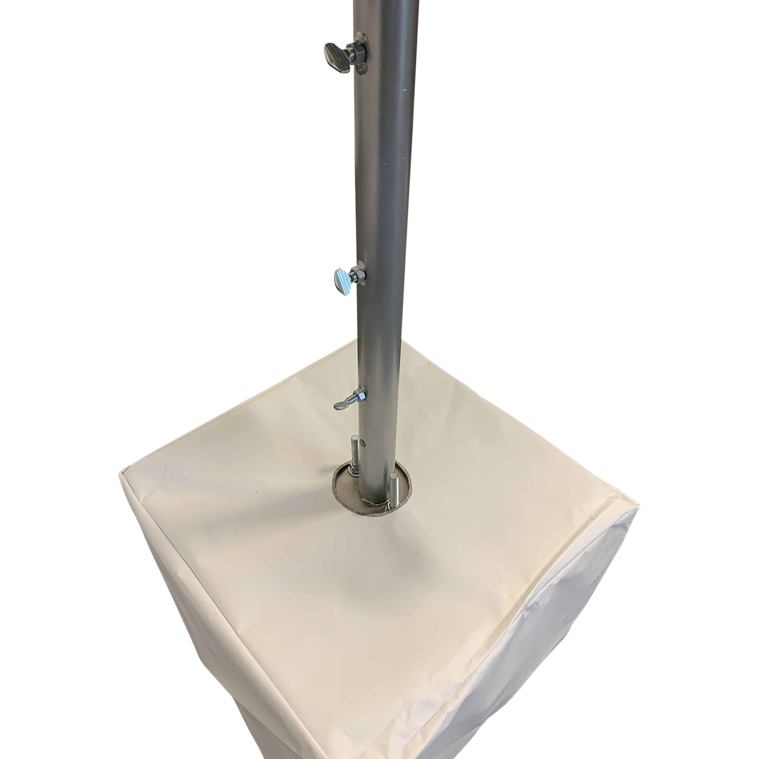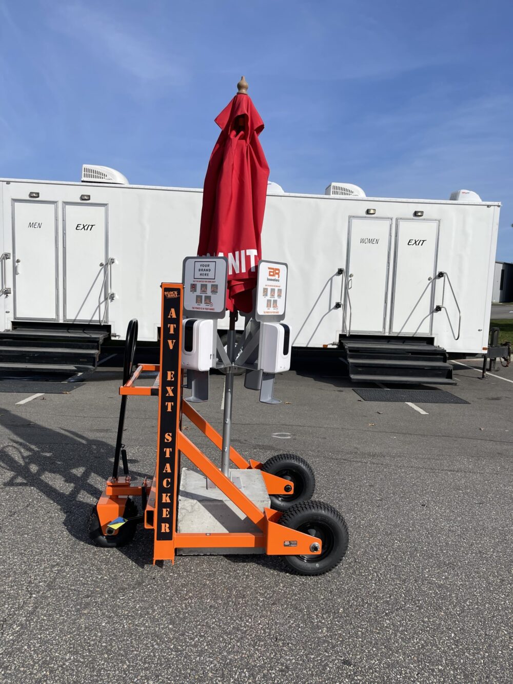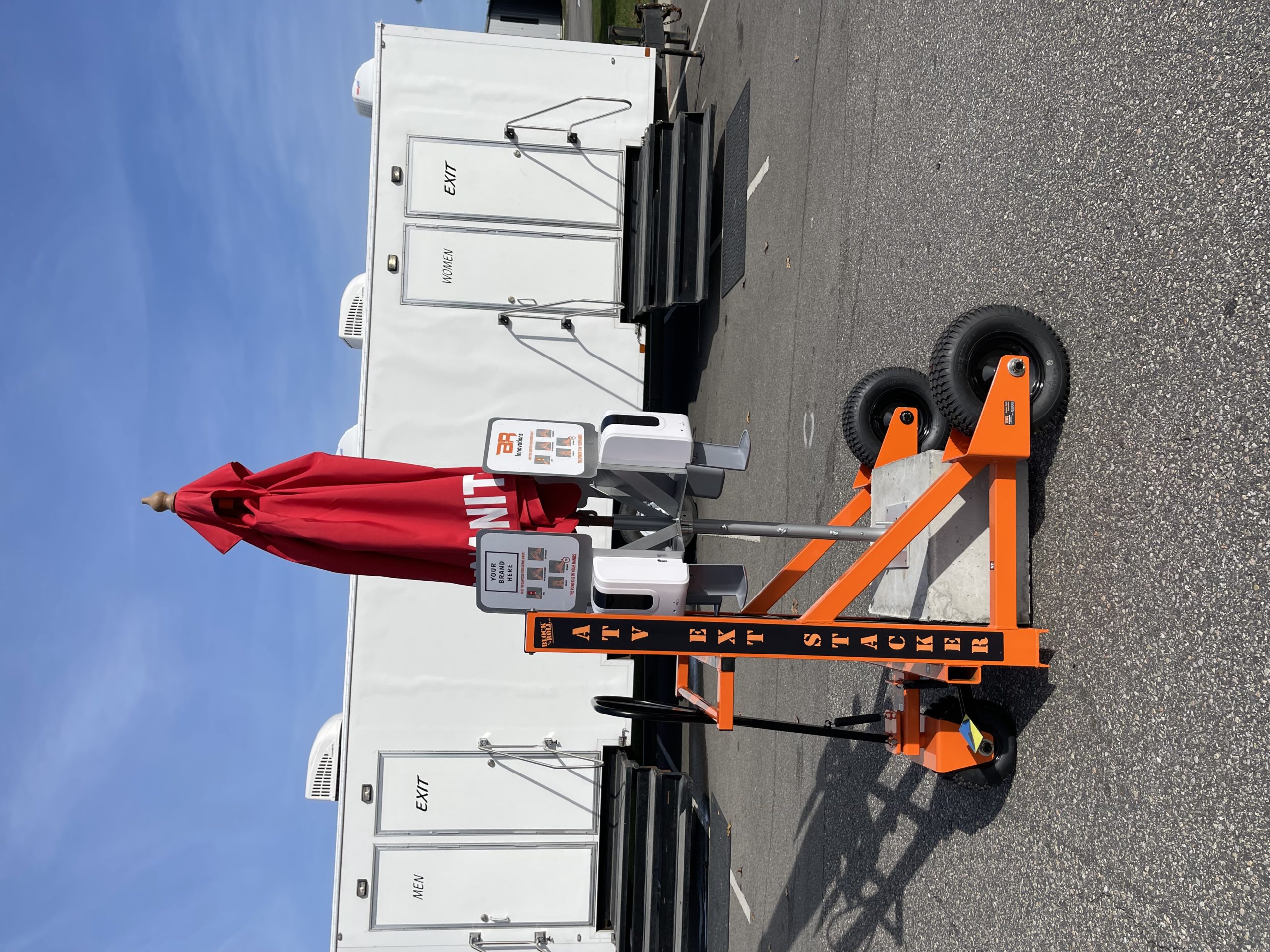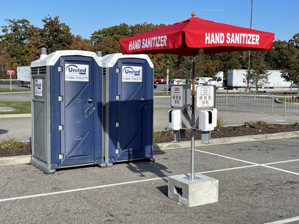 Unit includes 350lb concrete base, vinyl base cover, pole mount with umbrella pole, 1-4 sanitizer dispensers with brackets, 7′ Red “Hand Sanitizer” market umbrella.