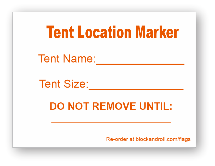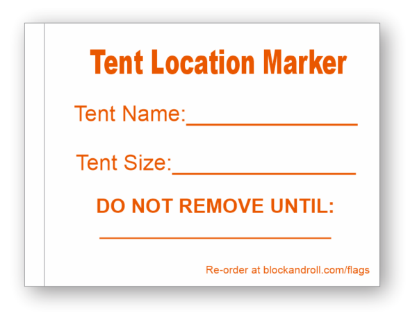 Markout flags have lines to write in name of tent, size and date to keep in the ground so landscapers do not remove.